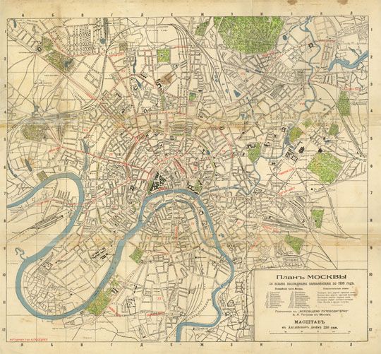 План Москвы со всеми последними изменениями по 1909 год. - [1:21000], 250 саж. в дюйме. - М., [1910] (Фото-цинкогр. т-во Н.Л. Казецкаго). - 1 к.: трехцв.; 58x61 см. - Прил. к "Всеобщему путеводителю А. Я. Петрова в Москве". План дан в пределах Камер-Коллежского вала с сеткой условных координат. Обозначены полицейские части Москвы. За основу взят "План города Москвы с объяснением к нему" (М., 1907).Ко 1/IX-79. 620х575мм