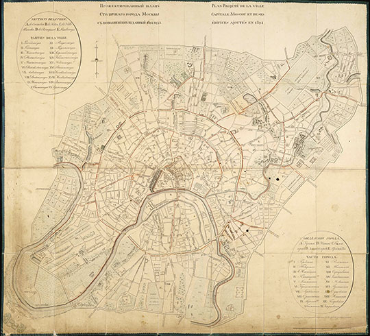 Прожектированный планъ Столичнаго города Москвы съ пополнениемъ изданный 1824 года — Plan Projete de la ville Capitale Moscou et de ses edifices ajoutes en 1824 ... Сост. E. Челиев. M., A. Семен, 1824. «Бокачев», 408, 410, 411. rpaв. на меди, раскр. 920х965 (no листу). Масштаб 1 : 12 600; 1 см = 126 м. К плану приложено «Изъяснение к прожектированному плану столичнаго города Москвы» (Изд. 3-е. М., А. Семен, 1824, 101 стр. + 1 вкл.), составленное Е. Челиевым. Текст на русском и французском языках с приложением краткого исторического очерка Москвы и таблицы расстояний между примеч