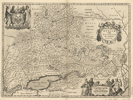 Южная часть России, в просторечии — Московии, v.4. Автор - Исаак Масса. Russiæ, vulgo Moscovia, Pars Australis. Auctore Isaaco Massa. Карта в Атласе Блеу: "Theatrum Orbis Terrarum, sive Atlas Novus in quo Tabulæ et Descriptiones Omnium Regionum, Editæ a Guiljel et Ioanne Blaeu" (Theater of the World, or a New Atlas of Maps and Representations of All Regions, Edited by Willem and Joan Blaeu), 1645.