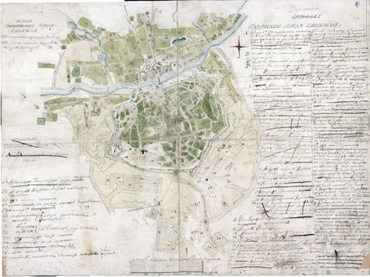 План губернского города Смоленска с поселенными при нем слободами. 1776 г. Масштаб - 100 сажен в английском дюйме. На полях - Изъяснение Губернского города Смоленска.