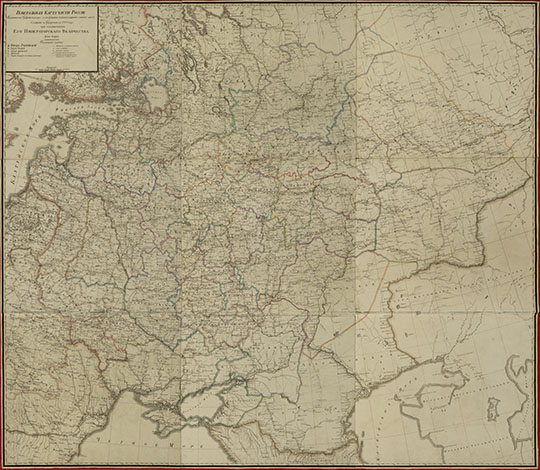 Генеральная Карта части России Разделенная на Губернии и уезды с изображением почтовых и других главных дорог / Сочинена и гравирована в 1799 году при собственном ЕИВ Депо Карт. - СПб.: Депо карт: 1799. - 1 л. склеен из 9 л.; 110,0х127,0 см /не опр./ (112,0х129,0 см). В футл. (40,0х45,0). На футл. надпись "Карта части России, 1799 года, Императорская Эрмитажная Иностранная библиотека": Грав. Раскраш. границы, усл.зн. насел. пунктов. Наклеен на зеленый шелк, окантован красной тканью.