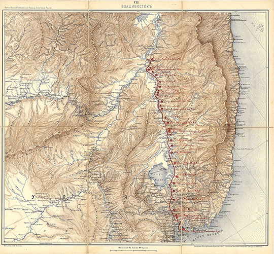Карта Уссурийской железной дороги. Масштаб - 40 верст в дюйме.. - Санкт-Петербург : МПС, 1888. - 1 л.: цв., спец. нагрузка нанесена от руки; 58 х 62 см, в обл. 30 х 22 см. Основой послужила топографическая "Карта Южной Пограничной Полосы Азиатской России", [л.] VIII "Владивосток". На карте вручную нанесена Уссурийская железная дорога со станциями и разъездами (от станции Хабаровка до станции Владивосток) KGR Ко 101/I-15;