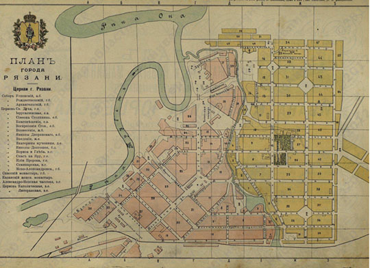 План города Рязани. Масштаб 100 саженей в дюйме. Из кн.: "Спутник по реке Волге и её притокам Каме и Оке. С картами Волги, Камы и Оки, видами и Планами волжских, камских и окских городов." Типо-Литография П. С. Феокритова, Саратов, 1905г.