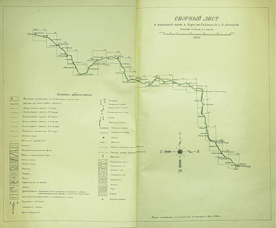 Река Волга.Из кн.: "Лоцманская карта реки Волги от Рыбинска до Нижнего Новгорода" - Н. Новгород, 1929. Масштаб - 500м в 1 см.