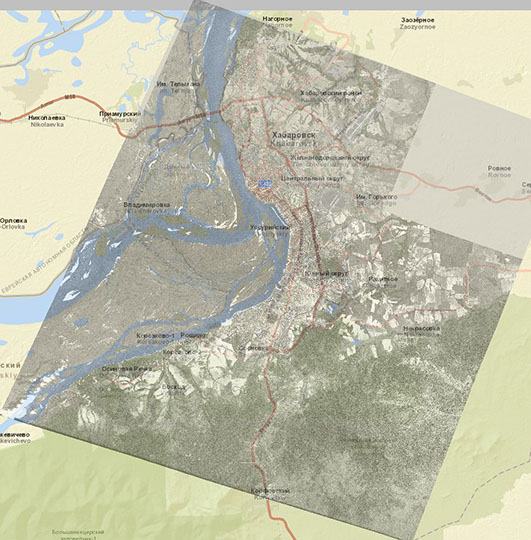 Фотография Хабаровска и окрестностей, сделанная с американского разведывательного спутника серии Corona 23 июня 1962 года. Оригинал находится в архиве Американского Геологического общества (U.S. Geological Survey National Center).