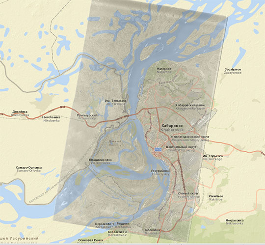 Фотография Хабаровска и окрестностей, сделанная с американского разведывательного спутника серии KH-7 Gambit камерой высокого разрешения (2-4 фута) 2 октября 1965 года. Оригинал находится в архиве Американского Геологического общества (U.S. Geological Survey National Center).