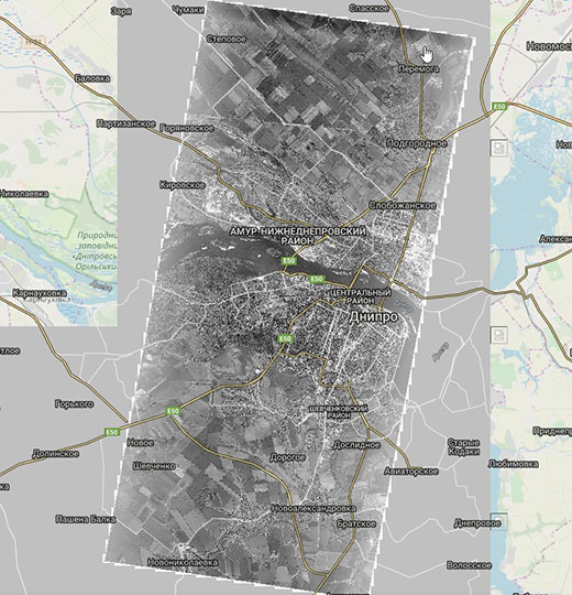 Американский спутниковый снимок города Днепропетровска и окрестностей. Снимок сделан 4 октября 1965 года.