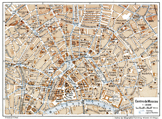 План центральной части Москвы. Подписи на французском языке. 1:20,000. Издание второй половины 1920-х годов. Institute de Geographie Flemming-Wiskott A.G. Glogau. Dresse par A. Rado.