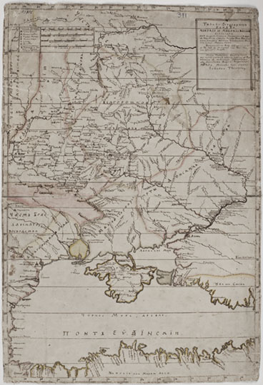 Карта Юга России, работа Брюса-Менгдена, русский рукописный вариант. В 1696 году Юрию фон Менгдену (Юрий Андреевич Фаменден) было поручено измерить и описать земли от Москвы до берегов Малой Азии и Крымской Татарии, после чего согласно этой описи капитан Я. В. Брюс составил карту. Первоначально была издана в 1696 году в рукописном варианте. В 1697-1698 годах была вывезена в Голландию. Там карта была гравирована и издана в представленном варианте в 1699 году по заказу Яна Тессинга.