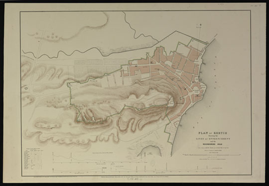 План Керчи с показанием линий укреплений и близлежащих холмов. 56 х 78 см. Масштаб - 12 дюймов в миле. Plan of Kertch, shewing the lines of entrenchment and the neighbouring hills / from a survey by Major Crease and Captain Ord.