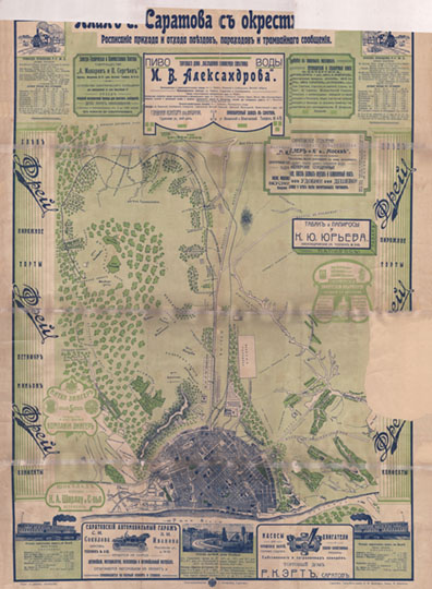 План г. Саратова с окрестностями. Расписание прихода и отхода поездов, пароходов и трамвайного сообщения. 1910-е годы. На полях - рекламные объявления. Издание П. Кочергина. Саратов. Типо-литография А.Ф. Винклер, бывшая Ф. Киммель.