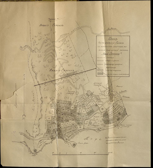 План части имения Симеиз с показанием участков, разбитых под дачный посёлок "новый Симеиз". Масштаб - 50 сажен в дюйме. Из кн.: Кузьменко, В.М. Новый-Симеиз и его окрестности на южном берегу Крыма : С краткими очерками по геологии и археологии местности, 2 схем. карт., 89 ил. и план. поселка с его окрестностями. Москва, 1913.