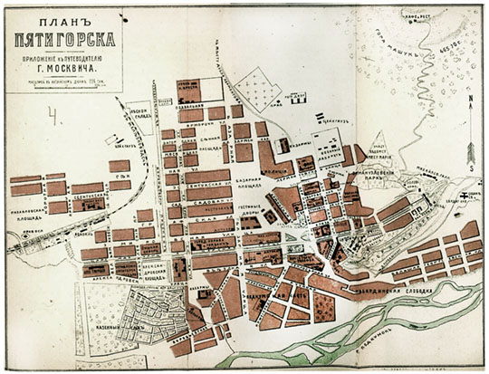 План Пятигорска. Приложение к Путеводителю Г. Москвича. Масштаб - в английском дюйме 226 сажен. Из кн.: Г. Г. Москвич